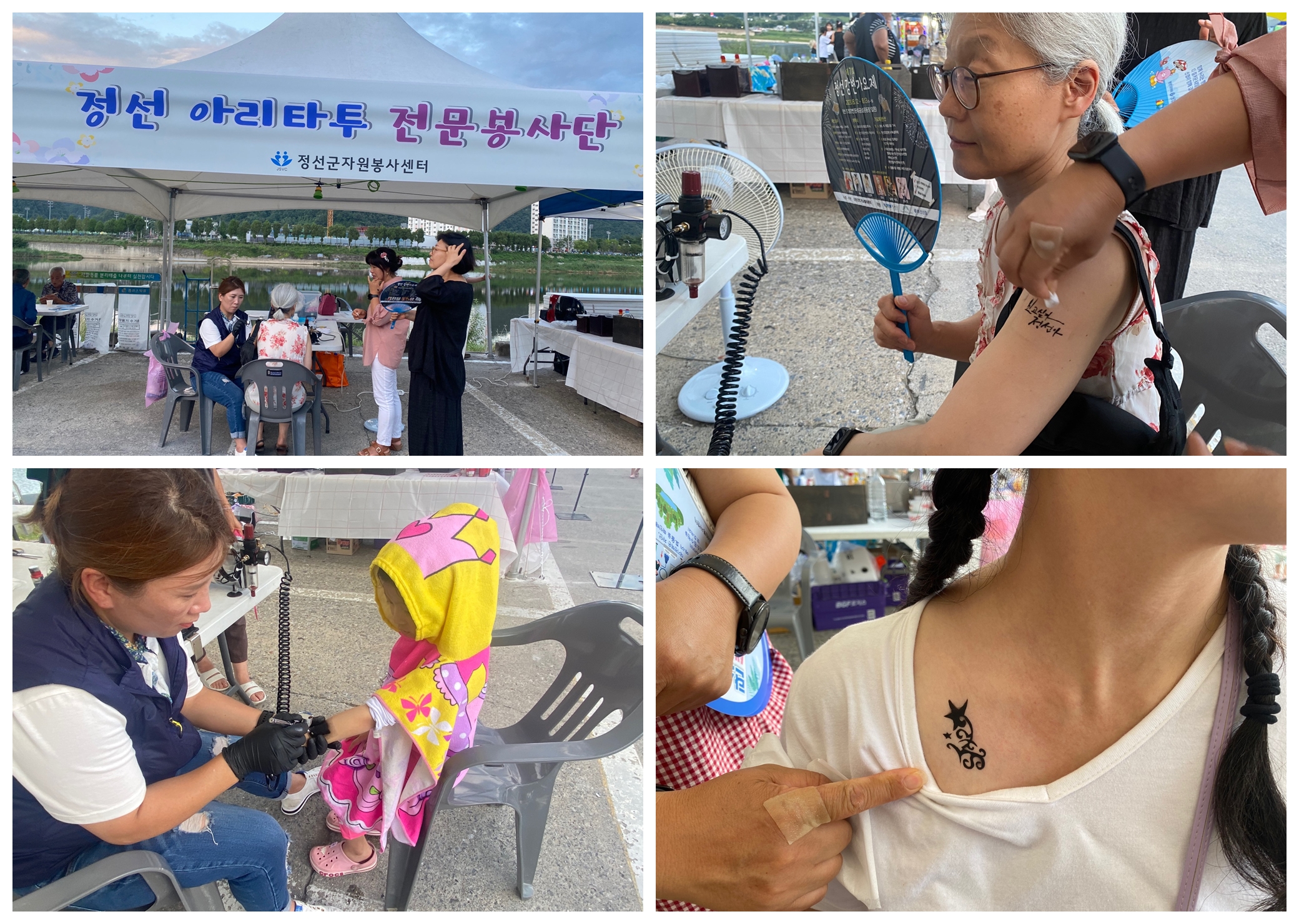 정선군자원봉사센터(센터장 장기봉)는 정선아리타투 전문봉사단(회장 김복희)과 함께 8월 18, 19일 제7회 정선강변가요제 행사장에서 에어브러쉬를 이용한 아리타투 봉사활동을 펼쳤다.
