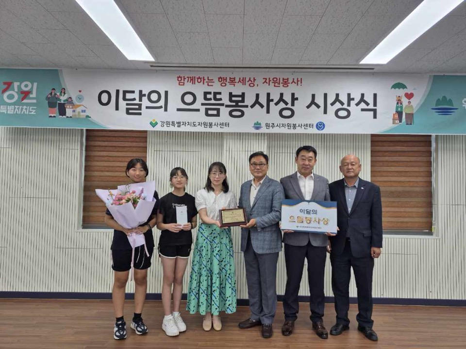 강원특별자치도자원봉사센터는 7월 15일 원주시자원봉사센터에서 으뜸봉사가족으로 선정된 '류수정 가족'에게 으뜸봉사 가족상을 시상하였다.