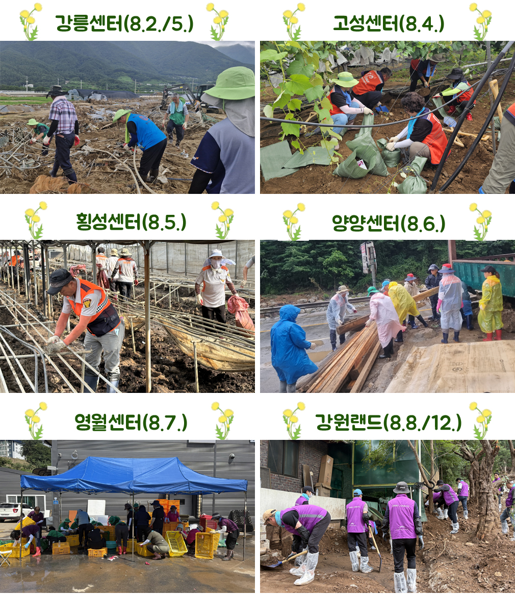 8월에는 강릉시자원봉사센터(2일, 5일)를 시작으로 고성군(4일), 횡성군(5일), 양양군(6일), 영월군(7일), 강원랜드(8일, 12일), 도청 동물방역과(9일) 등 9회에 걸쳐 5개 시군 및 2개 기관 323여명이 참여하였으며, 피해가구와 과수농가, 공장 등을 찾아 토사제거와 집기정리, 비닐하우스 정리 등의 자원봉사활동을 펼쳤다.