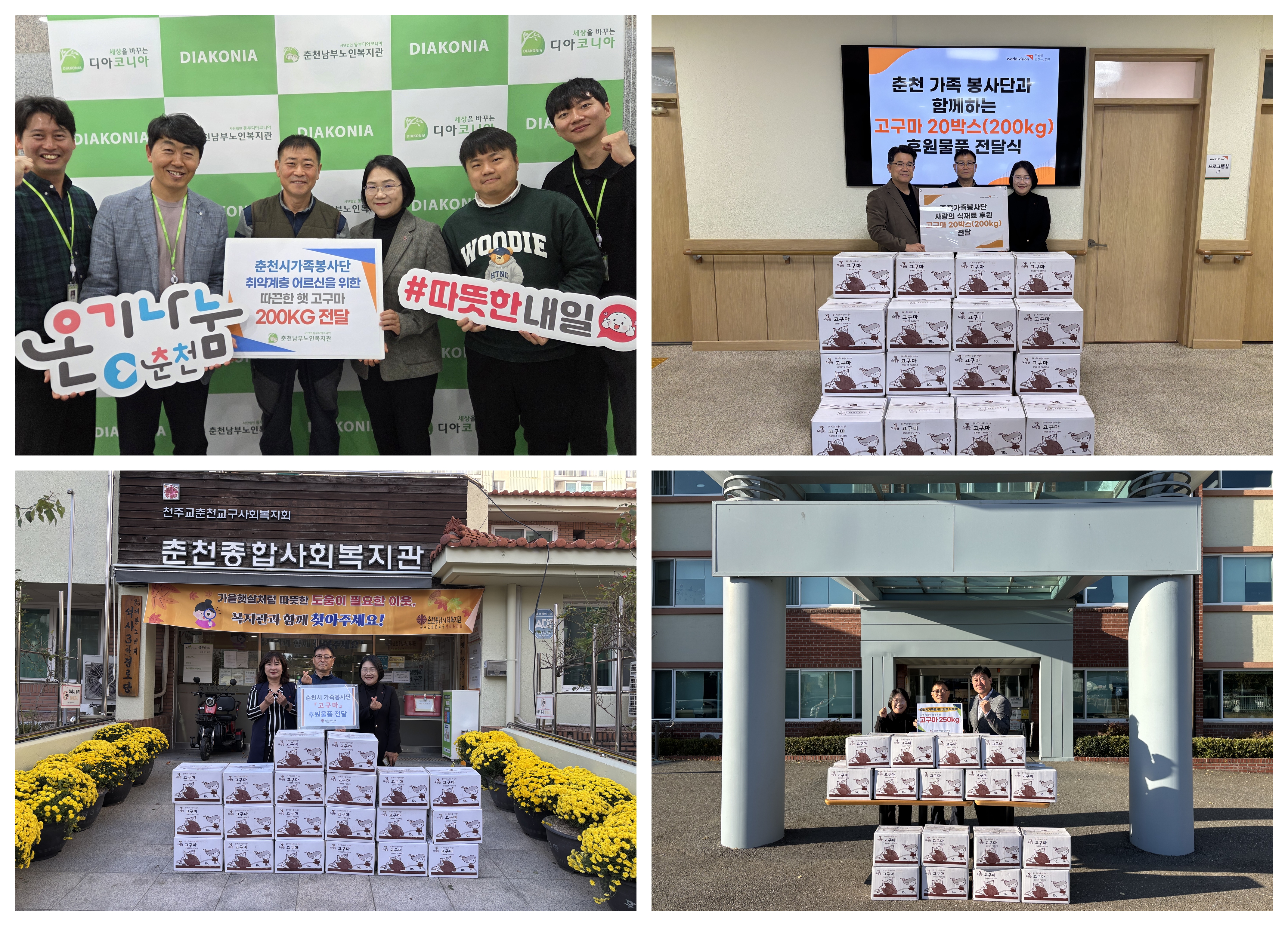 춘천시자원봉사센터(센터장 김숙경) 소속 춘천시가족봉사단(단장 이성학)은 지난 10월 28일, 강원특별자치도장애인종합복지관·춘천남부노인복지관·월드비전춘천종합사회복지관·춘천종합사회복지관 등 지역 내 4개 복지관을 방문해 직접 재배한 고구마 200㎏씩을 전달했다.