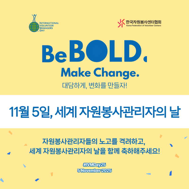 올해의 주제는 “Be BOLD. Make change.”(대담하게, 변화를 만들자!)입니다. 이는 자원봉사 관리자들이 이미 보여주고 있는 대담함을 인정하는 동시에, 조직과 지역사회가 이들을 적극적으로 행동에 나설 것을 권하는 메시지입니다.