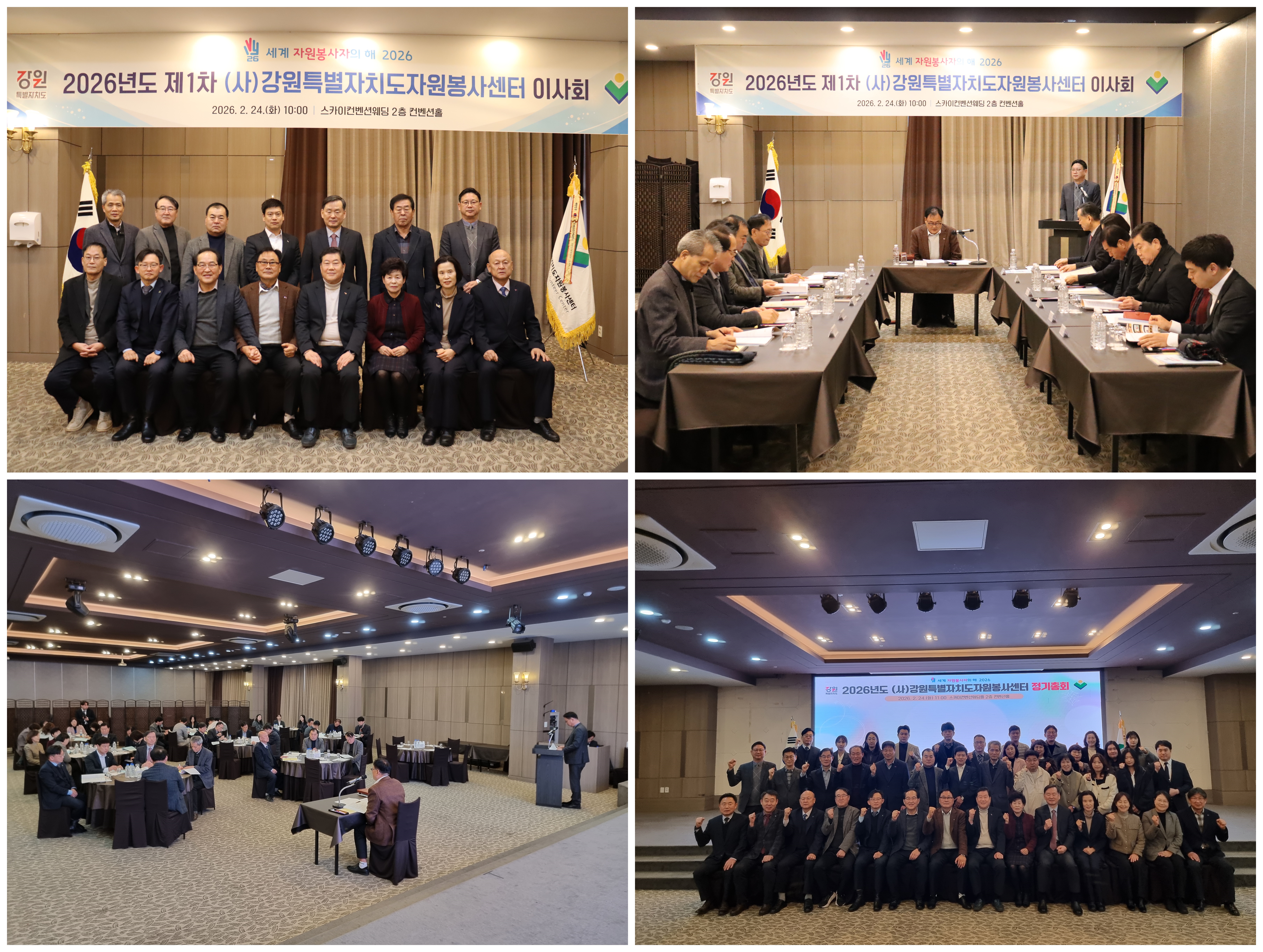 (사)강원특별자치도자원봉사센터(이사장 박광구)는 2월 24일(화) 춘천스카이컨벤션웨딩홀 2층 컨벤션홀에서 2026년도 제1차 이사회를 개최하고 ‘2025년도 사업실적 및 세입·세출 결산(안)’과 ‘2026년도 제1회 추가경정예산(안)’을 원안 가결하고, 센터장 공개 채용 결과 송근직 현 센터장 연임을 의결하였다.